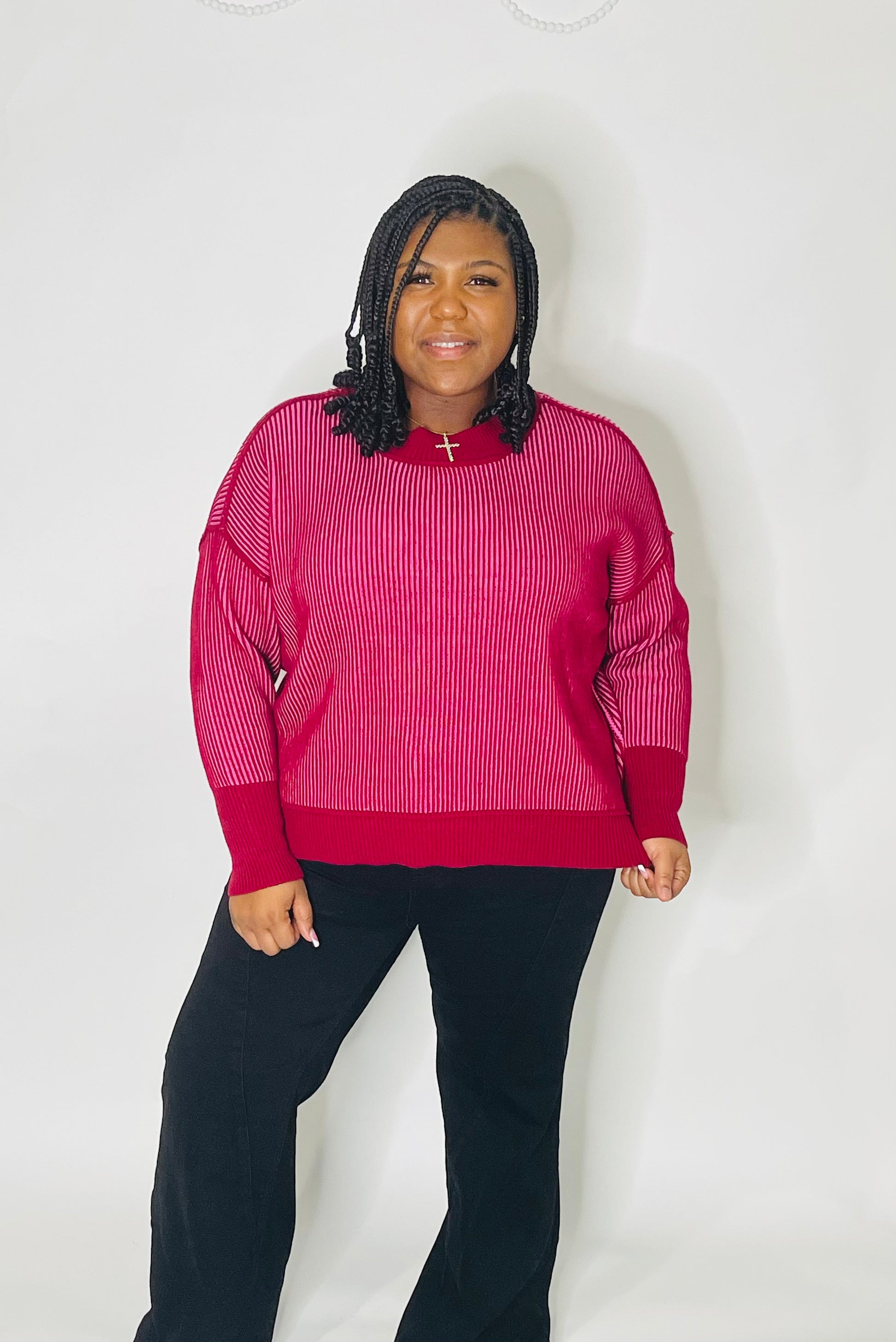 Elevate your knitwear collection with the Cabernet Kiss Stitch Sweater, a sophisticated blend of rich cabernet and soft candy pink hues. This expertly crafted piece features refined stitch detailing that adds visual interest and texture, making it versatile enough for both casual and polished occasions. The thoughtful color combination creates a modern aesthetic while maintaining timeless appeal. Perfect for layering or wearing solo, this sweater delivers both style and comfort for the discerning wardrobe.